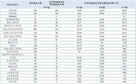 2015-2017届各院系毕业生签约世界500强企业的人数及比例