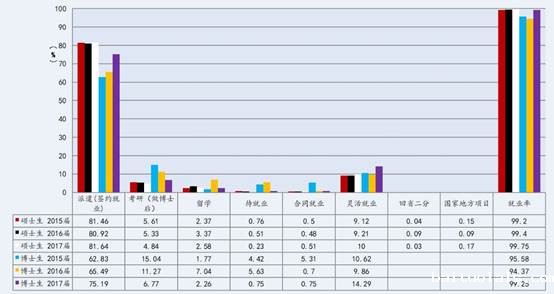 2015-2017届硕士毕业生人数逐年增加,分别为2621人、3322人、3530人,三届就业率分别为99.20%、99.40%、99.75%;三届博士毕业生分别略有增加,分别为113人、142人、133人,就业率分别为95.58%、94.37%、99.25%。
